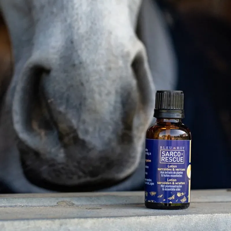Sarco-Rescue de Bleu-Roy est une lotion spécialisée formulée à partir d’extraits de plantes pour traiter efficacement les sarcoïdes et verrues chez le cheval. Cette solution externe stimule le système immunitaire local, assainit les lésions et favorise la régénération cutanée. Son pinceau intégré facilite l’application précise sur les zones concernées.