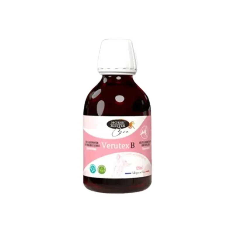 Verutex B de Horse Master est une solution à usage externe riche en extrait de thuya destinée au traitement local des verrues et des papillomes chez le jeune cheval et le cheval adulte.