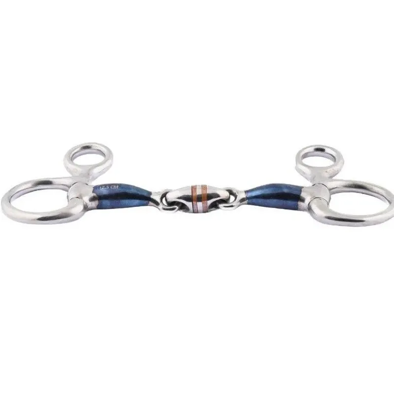 Mors Baucher anneaux de 45 mm, canon de 16 mm en Blue Steel. L’alliage Blue Steel qui recouvre cette gamme de mors Jump’In est composé de 54% de carbone et 46% de manganèse. Les mors Blue Steel s’oxydent au contact de l’air et de l’humidité. Il apparaît alors une fine couche de rouille au goût sucré qui stimule naturellement la production de salive. En salivant plus, le cheval prend plus de contact sur son mors. Dans ce processus d’oxydation la couleur va changer en gris/brun. Taille : 125 et 135.