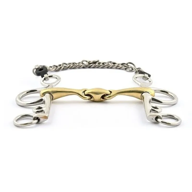 Le Pelham est un bon compromis entre la bride et le filet. Il offre un effet de levier plus ou moins fort en fonction de la longueur des branches, du réglage de la gourmette et de son montage. Il entraine une cession de nuque ainsi qu’une pression sur les mandibules.