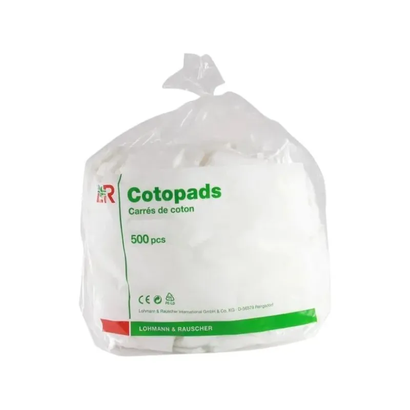 Cotons carrés Cotopads, pur coton Lohmann & Rauscher en petits carrés à usage unique, très utiles pour les soind du quotidien.