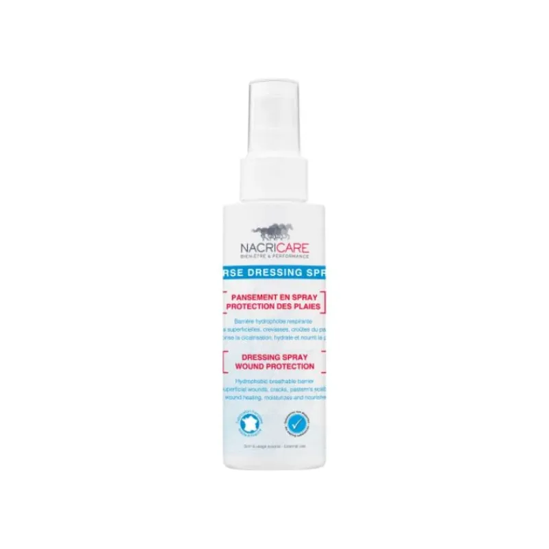 Horse Dressing Spray est un spray qui dépose un film hydrophobe sur les plaies superficielles du cheval : plaies cutanées, irritations, blessures de frottement, crevasses du paturon…