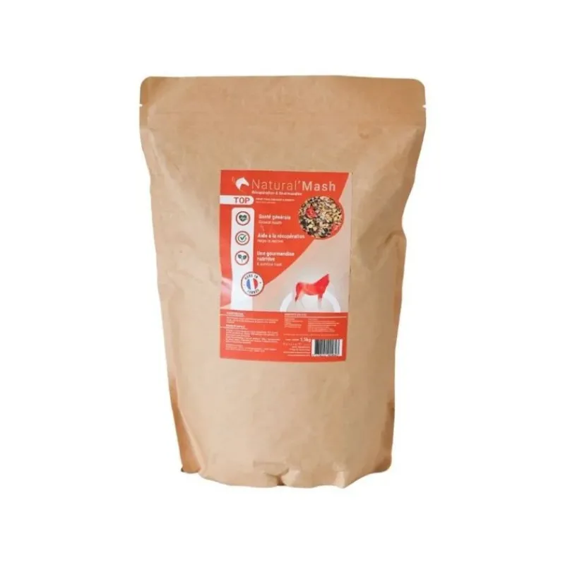 Le Natural’Mash Top est un aliment humide contenant environ 50% d’eau, ce qui le rend très digestible pour les chevaux. Grâce à son apport en glucides, il aide à reconstituer les réserves énergétiques du cheval. De plus, ses propriétés réhydratantes sont parfaites pour favoriser la récupération après un effort intense ou une séance d’entraînement. Ce mash contribue également au bien-être digestif et au bon fonctionnement du transit intestinal, à condition d’être distribué en quantité adéquate.