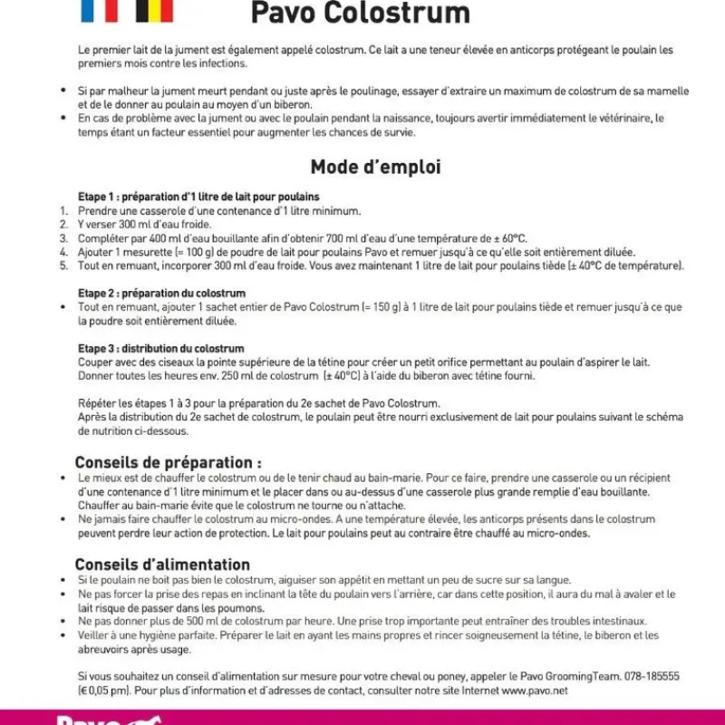 – Donnez au poulain au maximum 500 ml de colostrum par heure. Une consommation trop élevée de colostrum peut entraîner des troubles intestinaux.