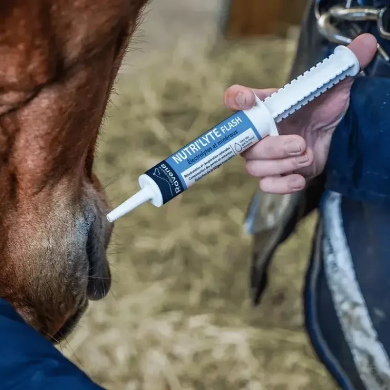 Donner une seringue directement dans la bouche du cheval lorsqu’il transpire (cause : effort intense, fortes chaleurs, transport, …)