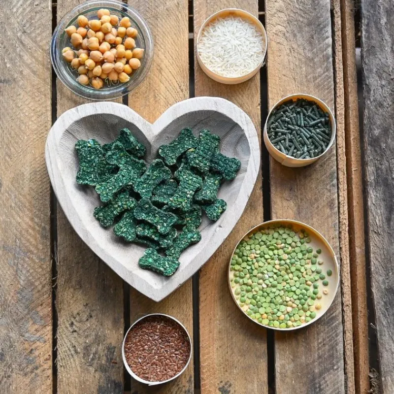 – Les Pois cassés et les Pois chiche sont riches en protéines et en fibres, tandis que les graines de Lin dorés regorgent d’acides gras essentiels pour une belle peau et un poil brillant.