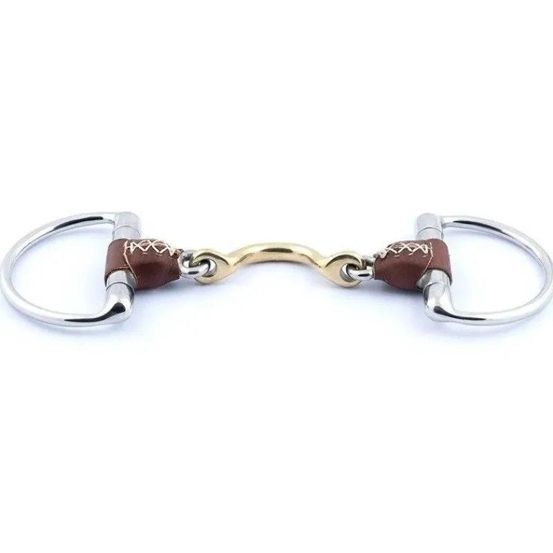 Mors à Olives à anneaux de 70 mm, canon large de 20 mm en Inox gainé de cuir et double brisure avec passage de langue en German Silver (65% cuivre, 23% zinc, 12% nickel, un alliage décontractant et solide). Les mors Jump’In composés de cuir sont très doux et confortables pour le cheval. Contrairement à l’Inox, le Sweet Iron ou à d’autres alliages, le cuir évite un contact trop froid.