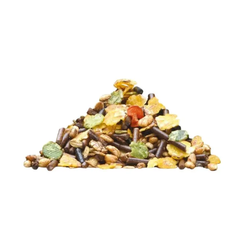 Son de blé, Flocons d’orge, Flocons de maïs, Luzerne deshydratée, Orge soufflée, Melasse de canne à sucre, Huile de colza, Carbonate de calcium, Flocons de pois, Levures de biere, Graines de lin cuites extrudées, Sel, Fructo-oligosaccharides, Carottes déshydratées, Huile de lin, Germes de blé.