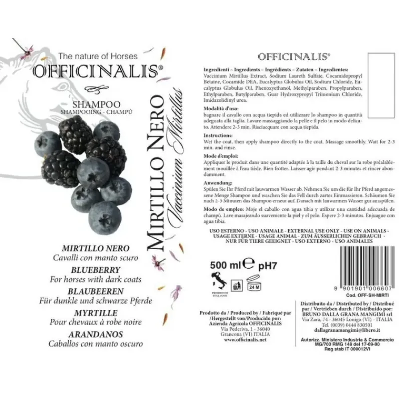 Ce shampoing Officinalis a été conçu pour les robes foncés. Il offre éclat et brillance aux crins et à la robe de votre cheval noir ou bai, nettoie et purifie tout en respectant son pH neutre. Il laissera une douce odeur de myrtille sur l’ensemble du corps de votre compagnon.