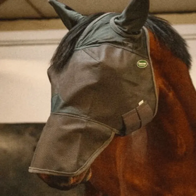 Masque Emouchine avec protection oreilles et naseau de Ravene – Masque anti mouche conçu pour protéger intégralement la tête de votre cheval contre les mouches et les insectes.
