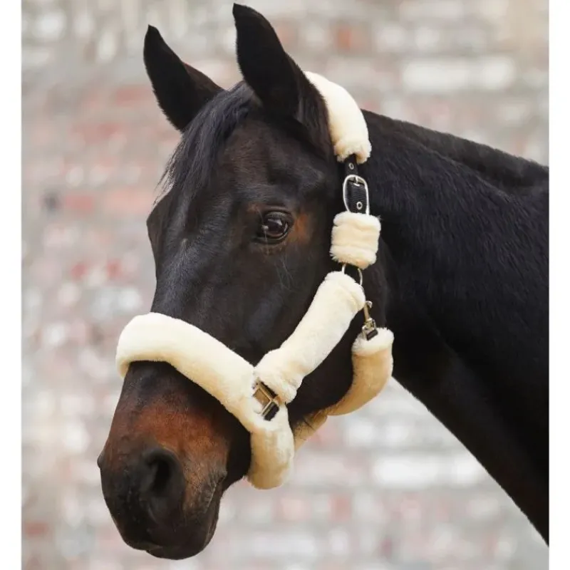 Licol Sangle complet, recouvert de fourrure synthétique. Idéal pour les chevaux sensibles, notamment pendant le transport. La têtière réglable des 2 côtés.